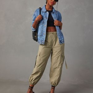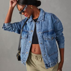 ● Relaxed fit ● Collared neckline ● Bust cargo pockets with button closures ● Elastic hem ● Front button closures ● Medium wash denim fabric ● 100% cotton ● Machine wash cold, tumble dry low.