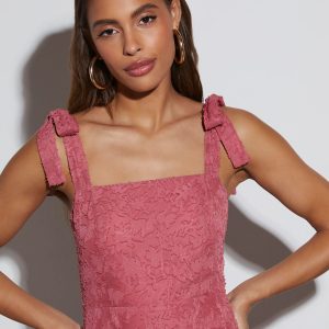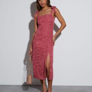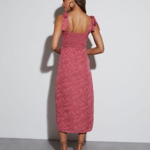 The Lisbeth Tie Straps Midi Dress features textured, floral embossing, tie straps, a smocked back and front slit. The perfect option for a romantic date or girls night out!