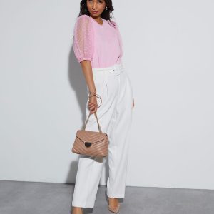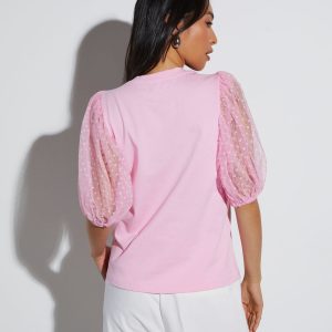 As the name suggests, this prim and proper top keeps things classy with a crew neckline and tulle, puff sleeves. We love the contrast of a solid bodice and the way this top looks when paired with high-waisted bottoms. Get it in both colors while you can.