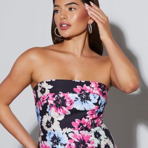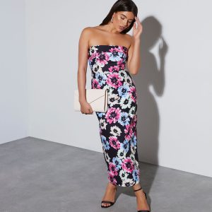 This vibrant floral print Thalia Strapless Floral Midi Dress is the perfect dress for guest of wedding or a special occasion.