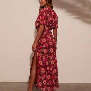 Be the hostess with the most style or best-dressed guest wearing the Theia Satin V-Neck Maxi Dress. It features a V-neckline, draped kimono short sleeves, and a stunning, thigh-high side slit. This shiny, satin fabric is so elegant! Finish off this glamorous look with shiny gold or silver accessories.